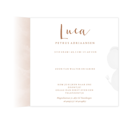 Daarnaast gaat mijn hart sneller kloppen van persoonlijke momenten. Het ontwerpen van geboortekaartjes, uitnodigingen, ´save the dates´ en andere unieke visuals voelt voor mij elke keer weer als een eer. Het zijn momenten vol betekenis, emoties en herinneringen, en ik neem graag de tijd om die met zorg en liefde te vertalen naar een ontwerp dat je voor altijd wilt bewaren.